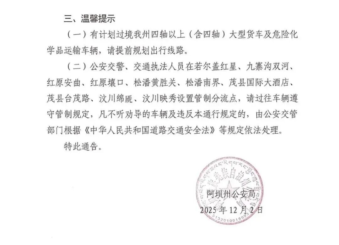 (一)2025年12月2日16时至2025年12月5日16时,危险化学品运输车辆禁止通行(可经G347茂县至北川段绕行);