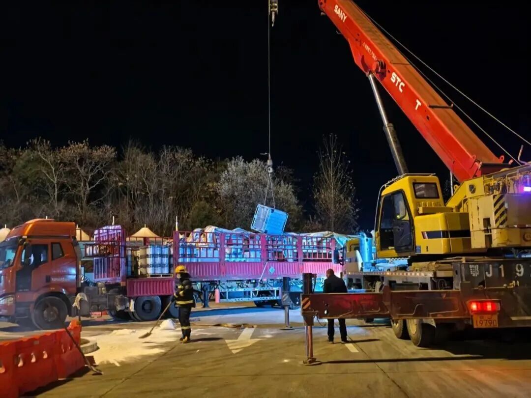 事件:12月23日6时56分,一托运危货挂车行驶至湖南郴州宜章西绕城大道与国道107交界处万悦府路段时发生侧翻,引发滴漏。