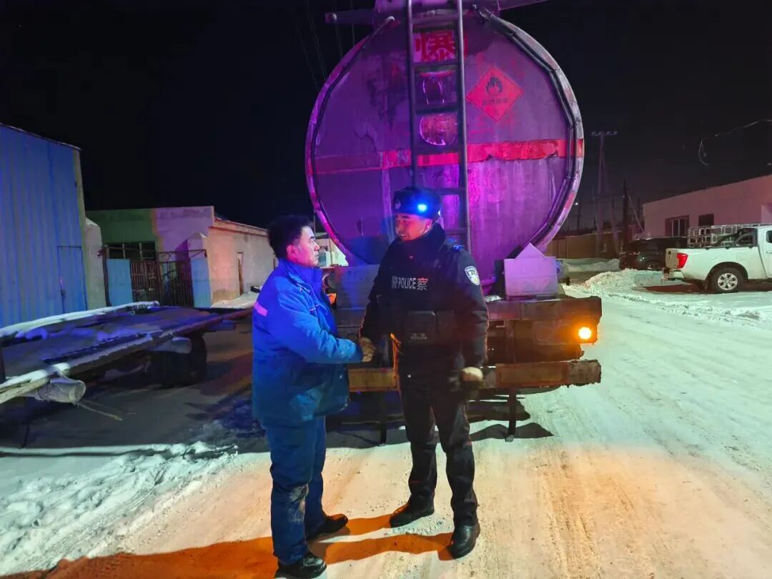 事件:12月23日晚10时许,张先生夫妇驾驶油罐车赴新疆哈巴河县南环路加油站送油,行驶至坎门尔村路口时,因路面冰雪覆盖打滑,车辆横停半坡,情况十分危急。