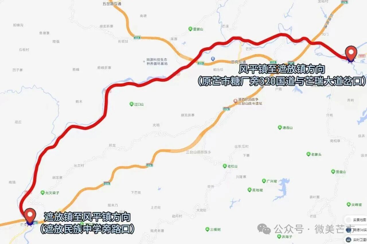 芒瑞大道风平镇至遮放镇段,具体为:风平镇至遮放镇方向(果朗河桥旁)国道320线与芒瑞大道交叉口(国道320线K3526+750米处)——遮放镇至风平镇方向(遮放民族中学旁路口)芒瑞大道与国道320线交叉口(国道320线K3554+900米处)。
