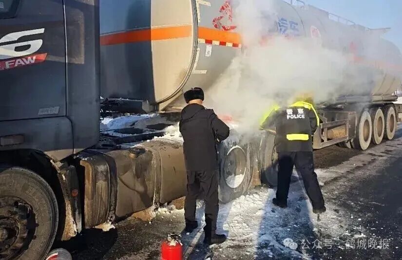 事件:近日,齐齐哈尔克东县交管大队民警巡逻至黑大公路往北安方向时,一辆停靠在路边的危险品运输车辆引起了民警的警觉。车身不断冒出阵阵白烟。民警心头一紧,深知车辆一旦火势蔓延,后果不堪设想。