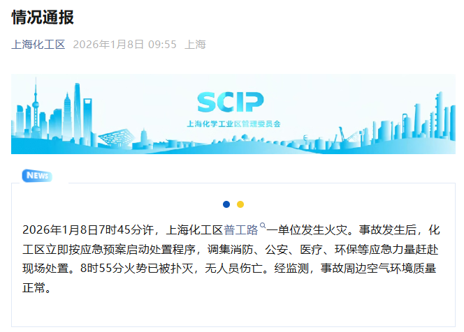 事件:1月8日上午8时左右,上海化工区普工路一单位发生火灾,据网传视频显示,事故现场火势猛烈,明火窜出数十米高并伴有大量黑烟冒出。目前,火势已被扑灭,暂无人员伤亡,火灾详细情况以官方通报为准。