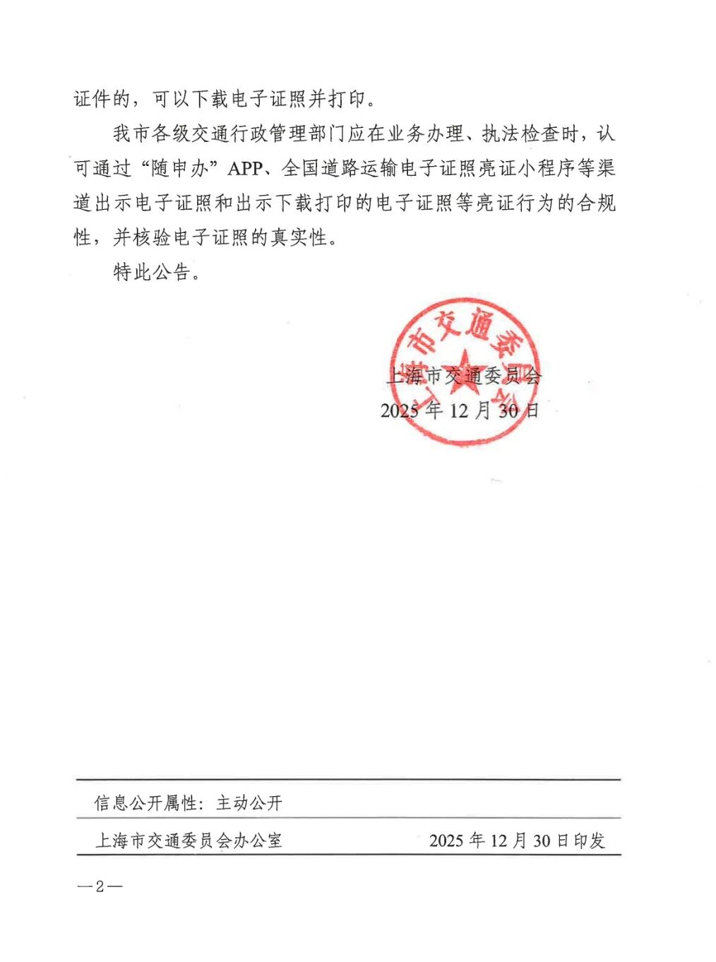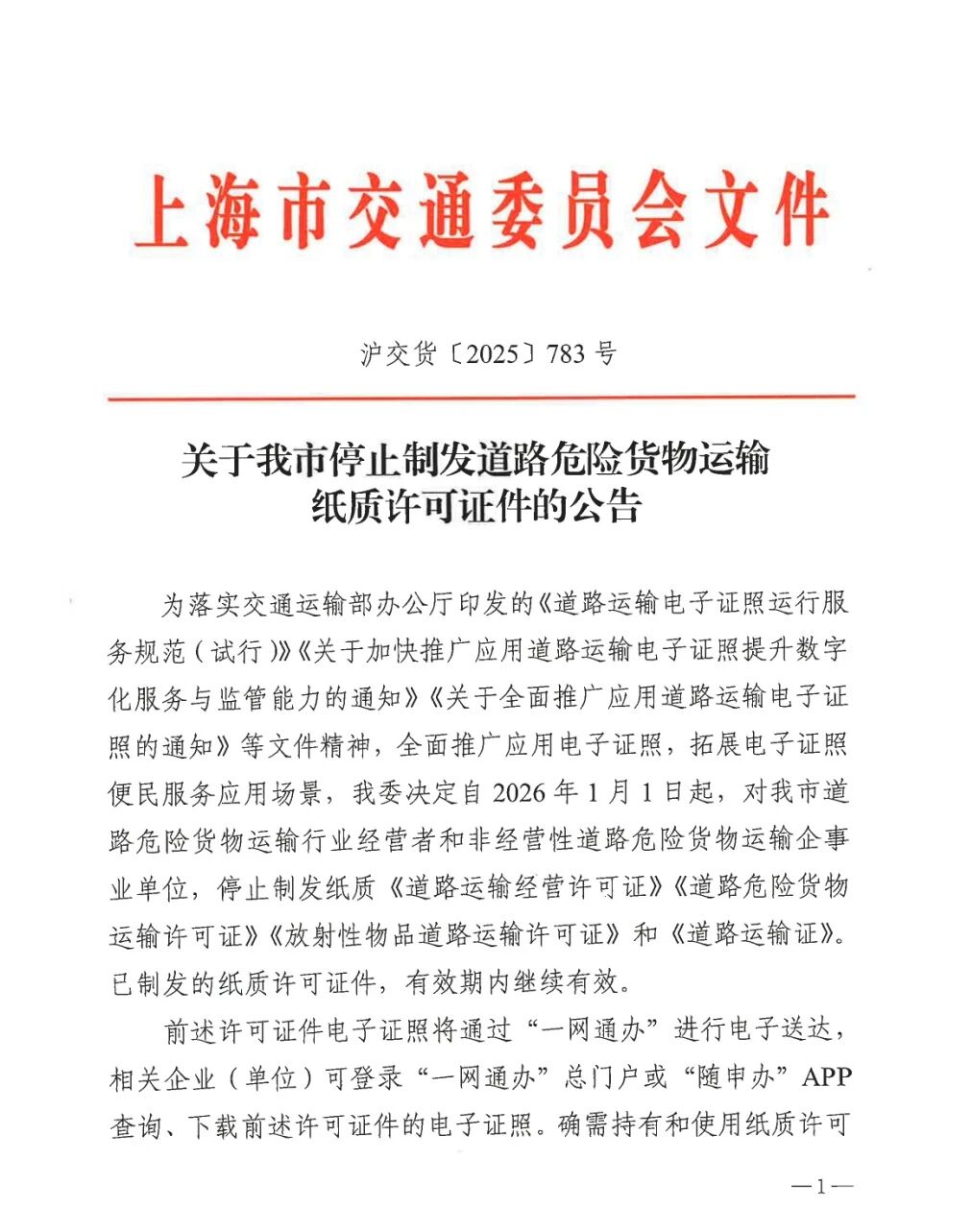 为落实交通运输部办公厅印发的《道路运输电子证照运行服务规范(试行)》《关于加快推广应用道路运输电子证照提升数字化服务与监管能力的通知》《关于全面推广应用道路运输电子证照的通知》等文件精神,全面推广应用电子证照,拓展电子证照便民服务应用场景,上海市交通委员会决定自2026年1月1日起,对上海市道路危险货物运输行业经营者和非经营性道路危险货物运输企事业单位,停止制发纸质《道路运输经营许可证》《道路危险货物运输许可证》《放射性物品道路运输许可证》和《道路运输证》。已制发的纸质许可证件,有效期内继续有效。