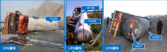 LPG槽罐车发生追尾、翻车、碰撞,罐体未受损,没有发生泄漏,但此时罐体的耐压能力可能受到影响,随着时间推移,气温上升饱和蒸汽压升高,车辆罐体可能发生瞬间泄压着火事故。