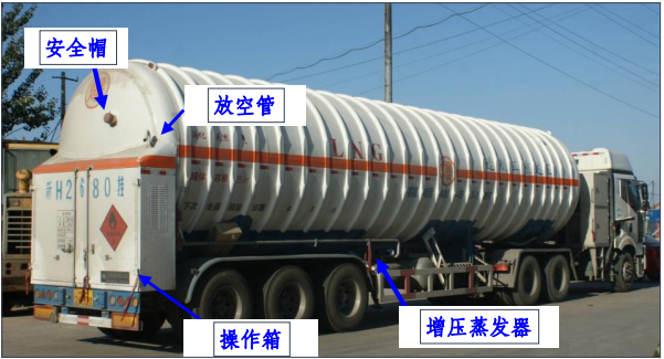 LNG罐车的管路操作系统集中设置在罐体后部的操作舱内,由液位计、紧急切断阀、低温截止阀、安全保险装置及管路导管、阻火器等组成。