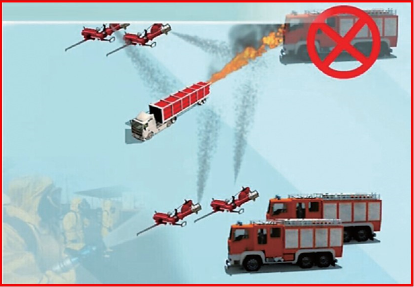 2.尽量减少一线作业人员,灭火冷却优选大流量遥控炮,稀释驱散优先水幕水带、水驱动排烟机;若罐体发生泄漏或真空有破损,则严禁向罐体射水。