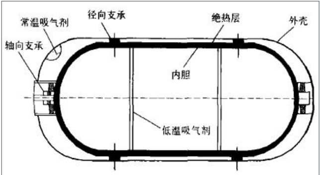 LNG罐车的液罐通过U形副梁固定在汽车底盘上,增压蒸发器置于车的右侧,管路控制系统集中布置在后操纵箱内。液罐为真空粉末绝热卧式夹套容器,双层结构,由内胆和外壳套合而成。