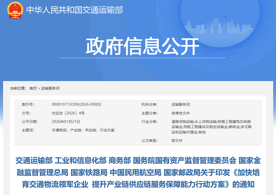 为贯彻落实党中央、国务院关于有效降低全社会物流成本的决策部署,培育壮大具有国际竞争力的交通物流企业,提升产业链供应链服务保障能力,更好服务支撑现代化产业体系建设,交通部等八部门印发《加快培育交通物流领军企业提升产业链供应链服务保障能力行动方案》。