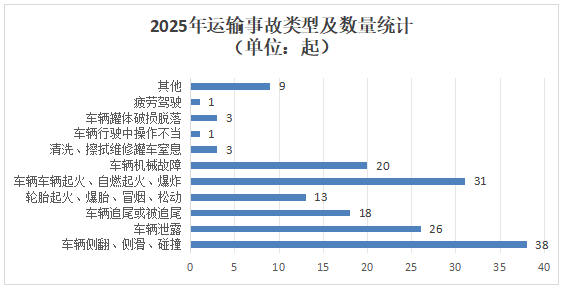 据分会统计,车辆侧翻、侧滑、碰撞事故:38起;车辆泄露事故:26起;车辆追尾或被追尾:18起;轮胎起火、爆胎、冒烟、松动:13起;车辆车辆起火、自燃起火、爆炸:31起,车辆机械故障:20起;清洗、擦拭维修罐车窒息:3起;车辆行驶中操作不当:1起,车辆罐体破损脱落:3起;疲劳驾驶:1起;其它(被前方车辆备胎导致事故、抛锚、避让、失控、原因不明)9起。