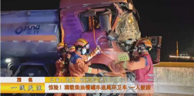 广东省茂名一满载柴油槽罐车追尾环卫车