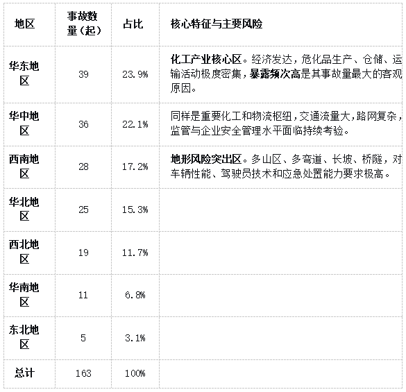 风险高度集中:仅侧翻/碰撞、火灾/爆炸、泄漏三类事故,合计就达95起,占事故总量的58.3%,是安全防控的绝对重点。