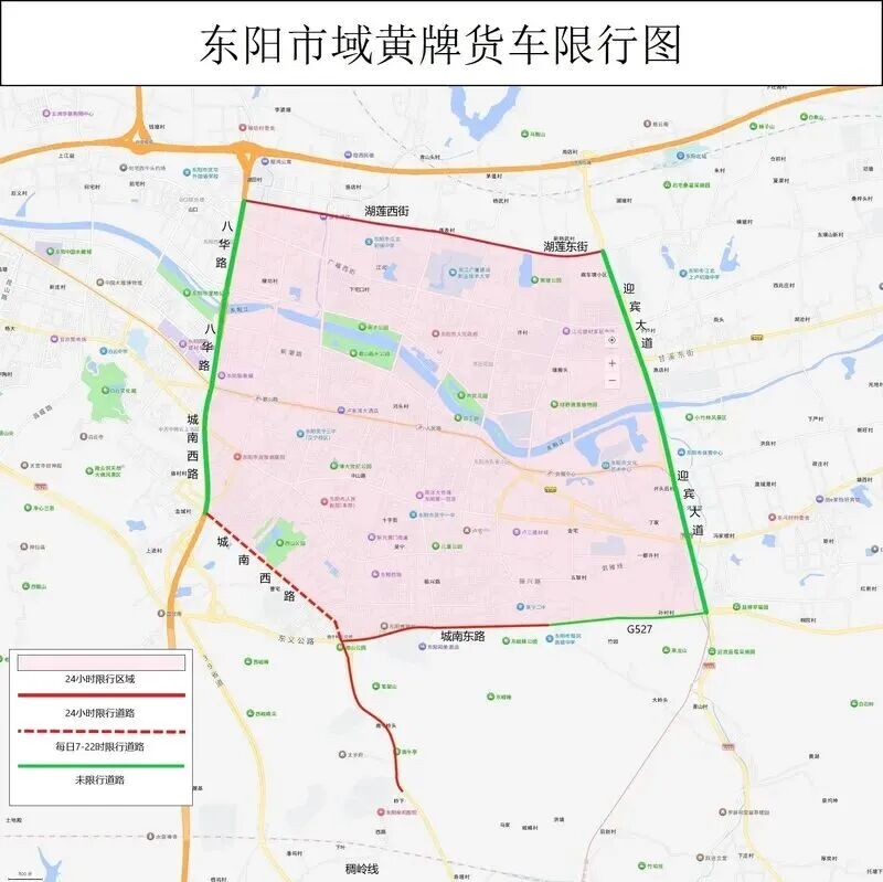 所有危化品运输车城区范围限行区域道路,由广福路向北调整至湖莲东街、湖莲西街,临界道路(湖莲东街、湖莲西街)、G351国道高架(迎宾大道至湖田)及迎宾大道连接隧道全天24小时限制通行。