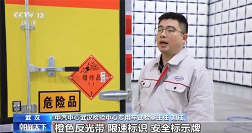 中汽中心武汉检验中心专用车试验室主任 刘成:像这辆车的反光标识、橙色反光带、限速标识、安全标示牌、危险货物标识,以及箱体颜色都是危险货物车辆视觉安全系统的组成要素。这不再是一个简单的标识,而是一个由多个元素构成的复合体系。