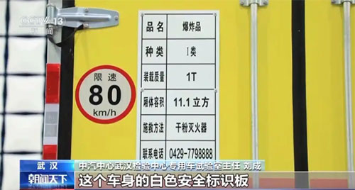 中汽中心武汉检验中心专用车试验室主任 刘成:这个车身的白色安全标识板,为可能发生的紧急情况提供应急处置依据,是救援人员的“行动指南”;限速标识是主动的行为引导,能明确告知其他车辆本车的最高速度限制,可以有效降低因长时间跟车或因速度差导致的不规范的超车等行为。