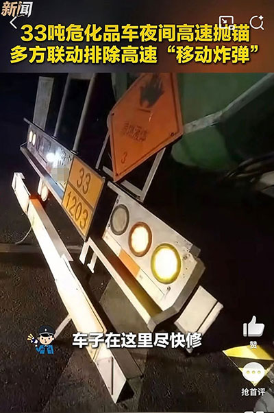 中国物流与采购联合会危化品物流分会:据了解,该车辆满载33吨汽油,属于易燃易爆高危危险化学品行驶途中右后车轮轴承突然损坏,无法正常行驶,只能临时停靠在应急车道,交警立即设置警戒区,联合高速公路管理处、消防等多部门合力排险。经多部门协作连夜处置,险情被成功排除,未发生泄漏及次生事故。向深夜守护者致敬!交警提醒:广大危化品运输车辆驾驶员,危化品运输车辆上高速前,一定要全方面检查到位,防止带“病”上路,行驶过程中如遇故障一定要“车靠边、人撤离、即报警”。