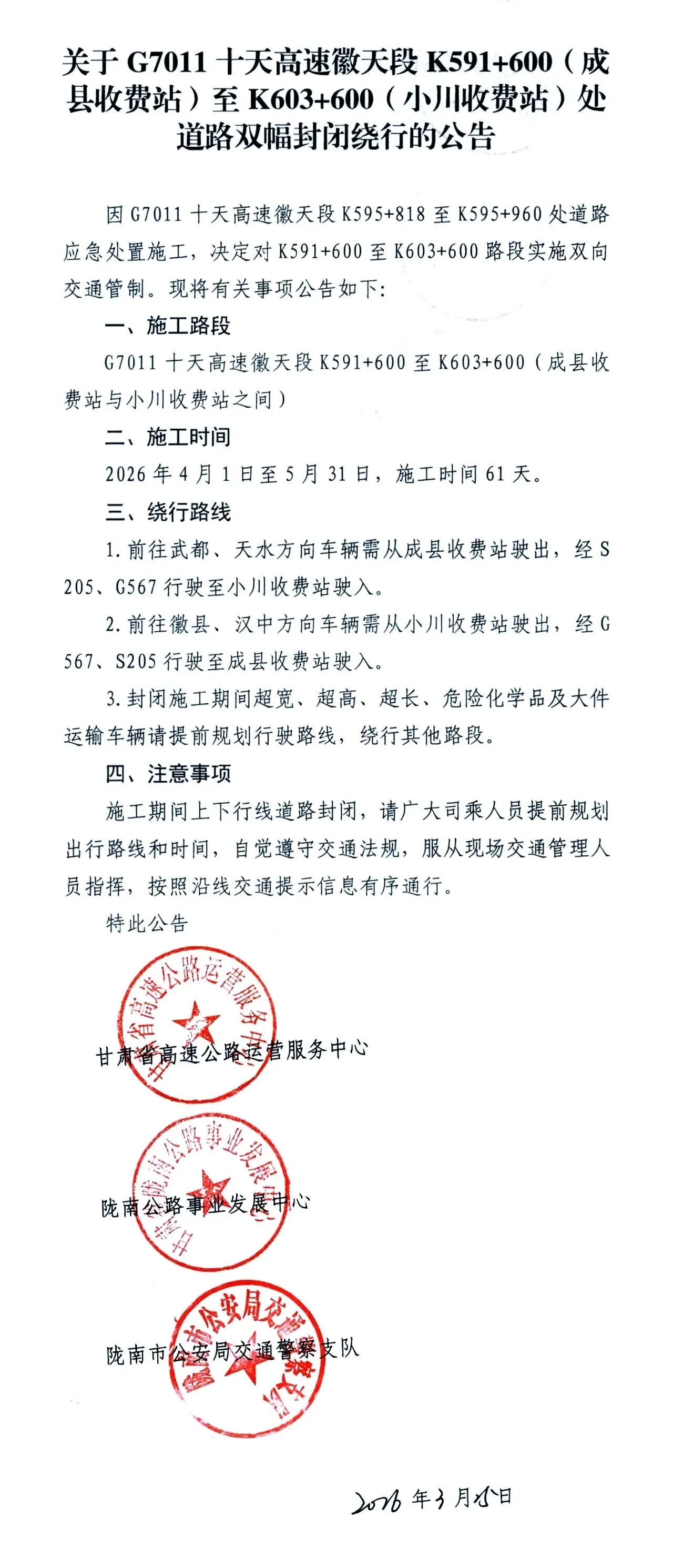 因G7011十天高速徽天段K595+818至K595+960处道路应急处置施工,决定对K591+600至K603+600路段实施双向交通管制。现将有关事项公告如下: