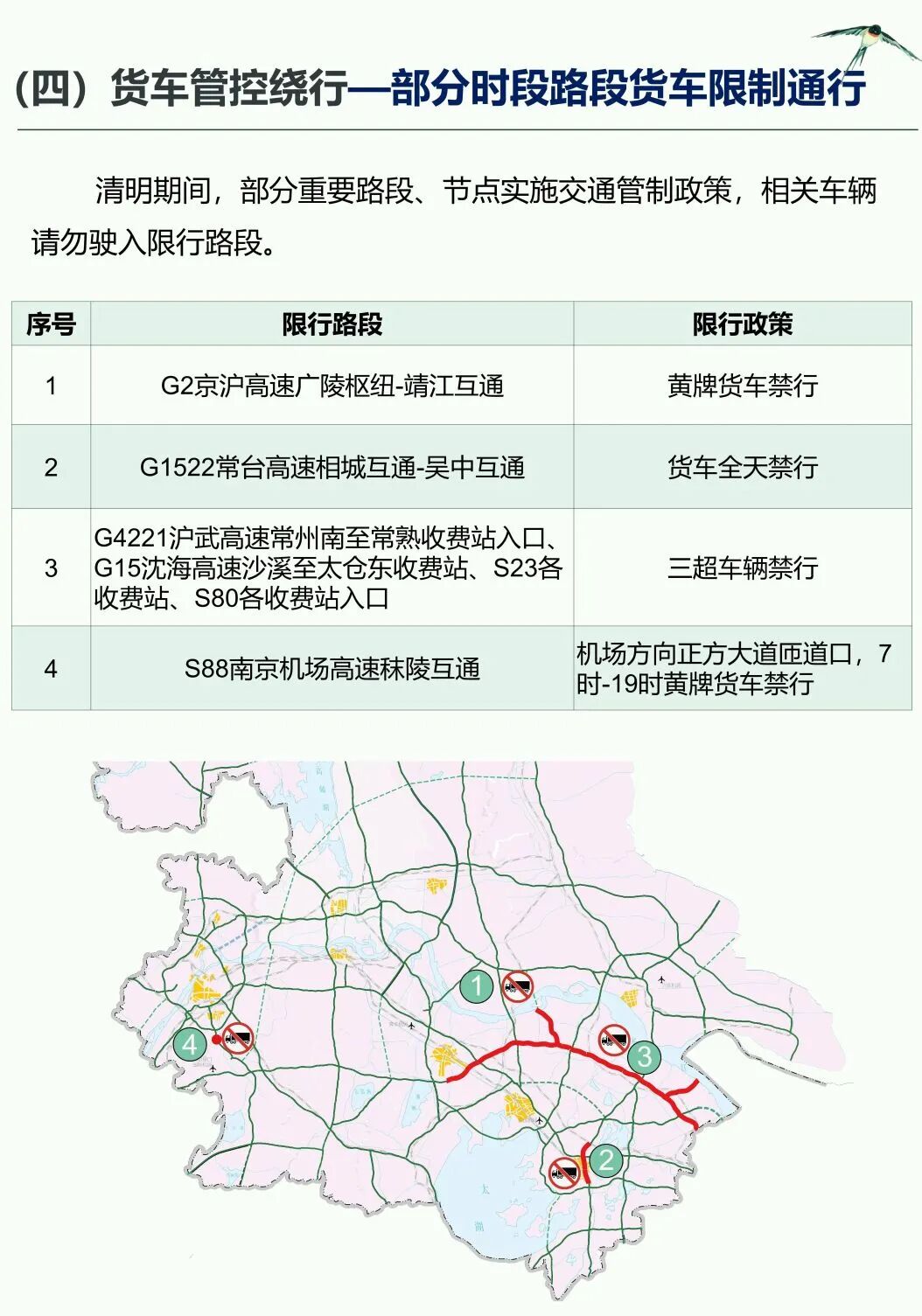 清明假期:南京市高速公路对危化品运输车全时段禁行。另外,部分重要路段、节点实施交通管控政策,请相关车辆假日期间提前绕行,勿驶入限行路段。