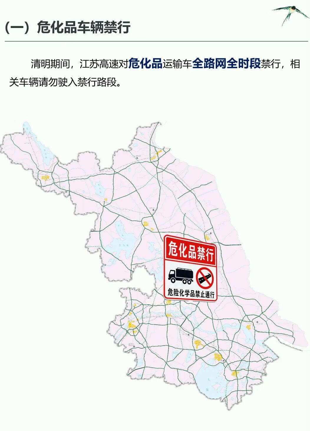 清明假期:江苏高速对危化品运输车全路网全时段禁行。部分重要路段、节点实施交通管制政策,相关车辆假日期间请勿驶入限行路段。