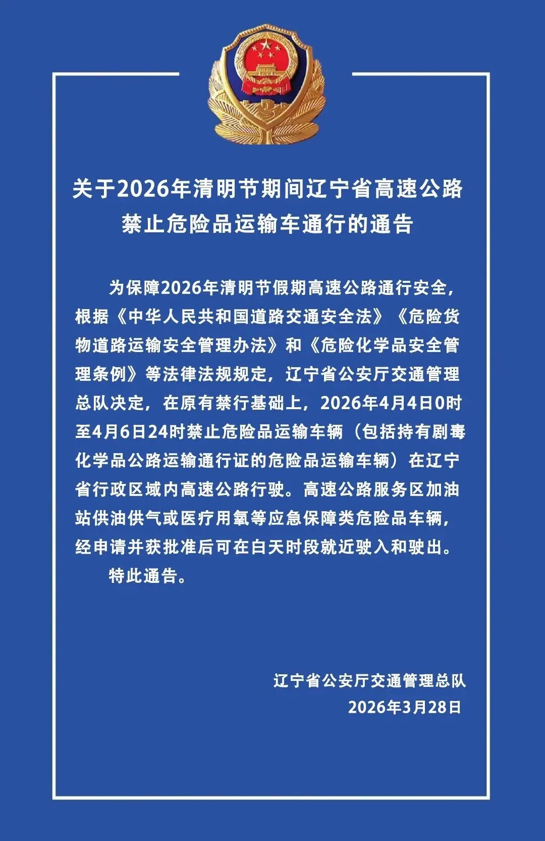 清明假期:为保障2026年清明节假期高速公路通行安全,根据《中华人民共和国道路交通安全法》《危险货物道路运输安全管理办法》和《危险化学品安全管理条例》等法律法规规定,辽宁省公安厅交通管理总队决定,在原有禁行基础上,2026年4月4日0时至4月6日24时禁止危险品运输车辆(包括持有剧毒化学品公路运输通行证的危险品运输车辆)在辽宁省行政区域内高速公路行驶。高速公路服务区加油站供油供气或医疗用氧等应急保障类危险品车辆经申请并获批准后可在白天时段就近驶入和驶出。
