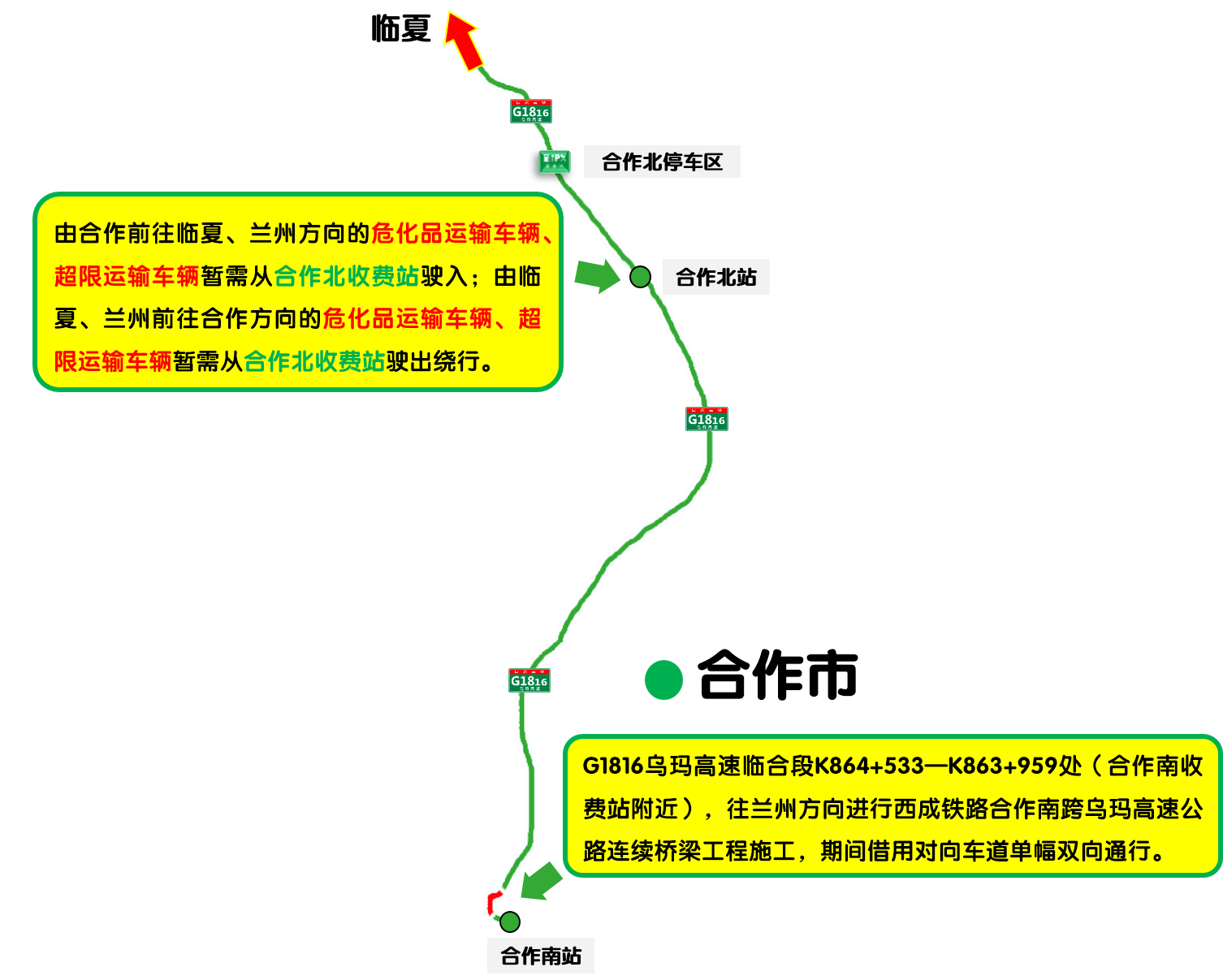 G1816乌玛高速临合段K864+533—K863+959处(合作南收费站附近),往兰州方向进行西成铁路合作南跨乌玛高速公路连续桥梁工程施工,期间由合作前往临夏、兰州方向的危化品运输车辆、超限运输车辆暂需从合作北收费站驶入;由临夏、兰州前往合作方向的危化品运输车辆、超限运输车辆暂需从合作北收费站驶出绕行。请途经车辆减速慢行,注意行车安全。预计2026年7月25日结束。