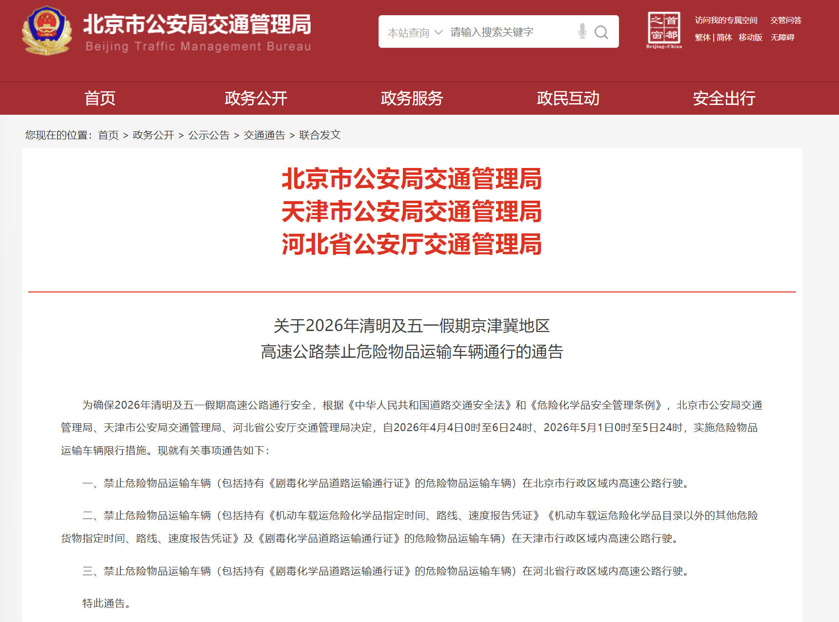 清明假期:为确保2026年清明及五一假期高速公路通行安全,根据《中华人民共和国道路交通安全法》和《危险化学品安全管理条例》,北京市公安局交通管理局、天津市公安局交通管理局、河北省公安厅交通管理局决定,自2026年4月4日0时至6日24时、2026年5月1日0时至5日24时,实施危险物品运输车辆限行措施。现就有关事项通告如下: