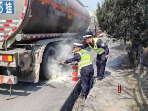 事件:3月27日11时许,长治交通八大队店上中队民警巡逻至辖区519国道东白兔村附近路段时,发现一辆行驶中的危化品半挂牵引货车右后轮处突然冒起黑烟,继而有火苗蹿出。