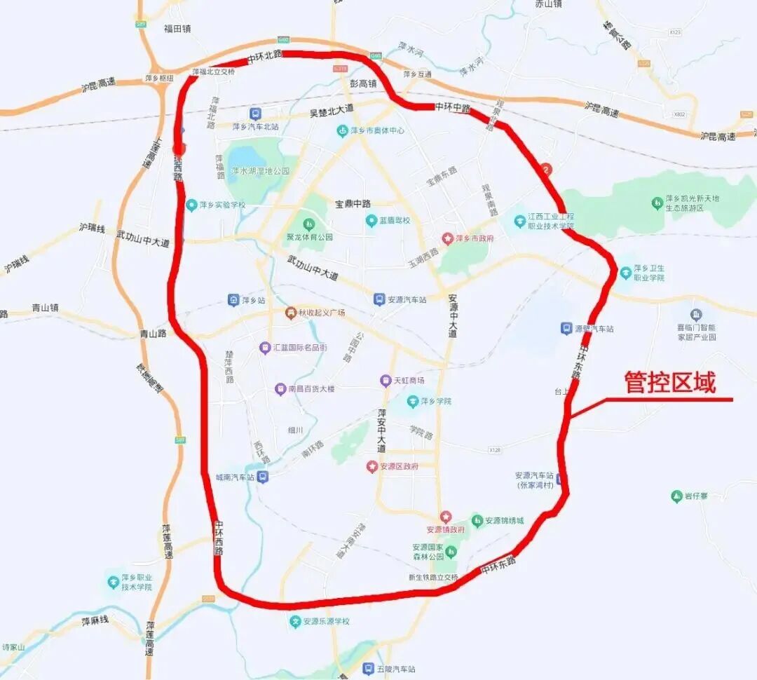 中心城区中环路合围区域(中环东路、中环南路、中环西路、中环北路合围范围,不含中环路本路),涵盖安源区核心城区及经开区光丰街道、福田镇、彭高镇等核心管控范围。