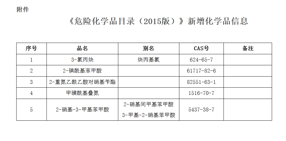近日,依照《危险化学品安全管理条例》有关规定,应急管理部会同工业和信息化部、公安部、交通部等10部门决定,将3-氯丙炔、2-碘酰基苯甲酸、2-重氮乙酰乙酸对硝基苄酯、甲磺酰基叠氮、2-硝基-3-甲基苯甲酸等5种化学品纳入《危险化学品目录(2015版)》。应急管理部将配套补充完善《危险化学品分类信息表》。