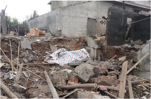 公路上随处可见散落的瓦片和水泥块,四周的植物也被爆炸波及,部分竹子被震断,附近民居的玻璃也被全部震碎。涉事房屋是一栋两层小楼,爆炸现场一片狼藉,现场散落着砖瓦、玻璃等大量碎片,屋内还残留着大量鞭炮半成品及鞭炮纸屑。屋内至少有两间房屋被震塌,整个屋内有一股鞭炮燃放后的气味。屋内存放了大量半成品鞭炮,也有很多易燃易爆的物品。工人就在这个房间里加工,把半成品加工成鞭炮再往外销售。房东陈富军介绍,发生爆炸楼房是其在三十天前租给欧成良的。