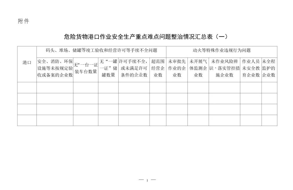 (四)加强定期调度。部将建立季度调度机制,并将重点难点问题纳入部年度安全生产检查内容,对责任不落实、推进工作进度滞后的省份进行约谈,并将各地整治工作开展情况作为年度交通运输领域平安建设考核评价重要参考。所在地交通运输主管部门要做好每季度整治工作进展情况总结,并填写《危险货物港口作业安全生产重点难点问题问题整治情况汇总表》(附件),省级交通运输主管部门应于每季度末月25日前将书面总结和汇总表格报部。