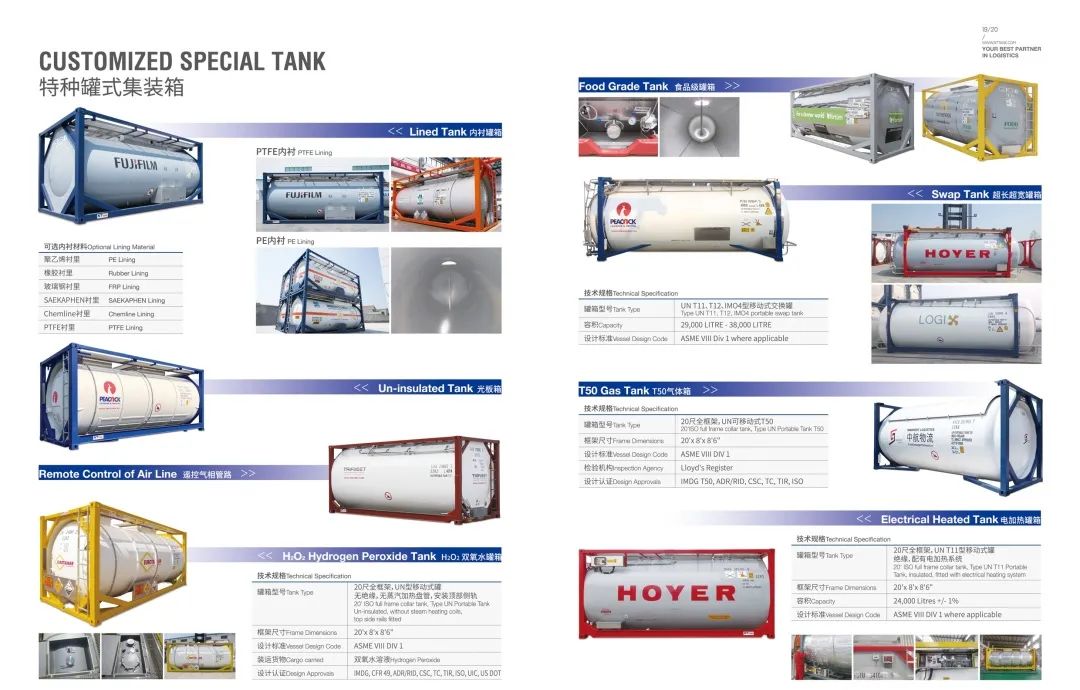 主要产品:ISO罐式集装箱、制冷机组/加热罐箱、氢氟酸罐箱、高纯液氨罐箱、内衬罐箱、超长超宽箱、T20/T22罐箱、气体罐箱、29.5KL/30KL方圆罐箱、近海罐箱、中型散装容器IBC等罐箱产品。设计生产能力:标箱8000台/年,特箱2000台/年。公司罐箱车间占地面积8万平方米。堆场面积2万平方米。为保证罐箱的高品质,现已装备了先进的生产设备,如:法国等离子/TIG焊拼板机、瑞典卷板机、美国MIG自动焊和TIG手动焊机,南非全自动三位喷淋式表面处理系统以及全自动X射线及时成像探伤测试系统,拥有目前世界罐箱制造行业中先进的生产线。